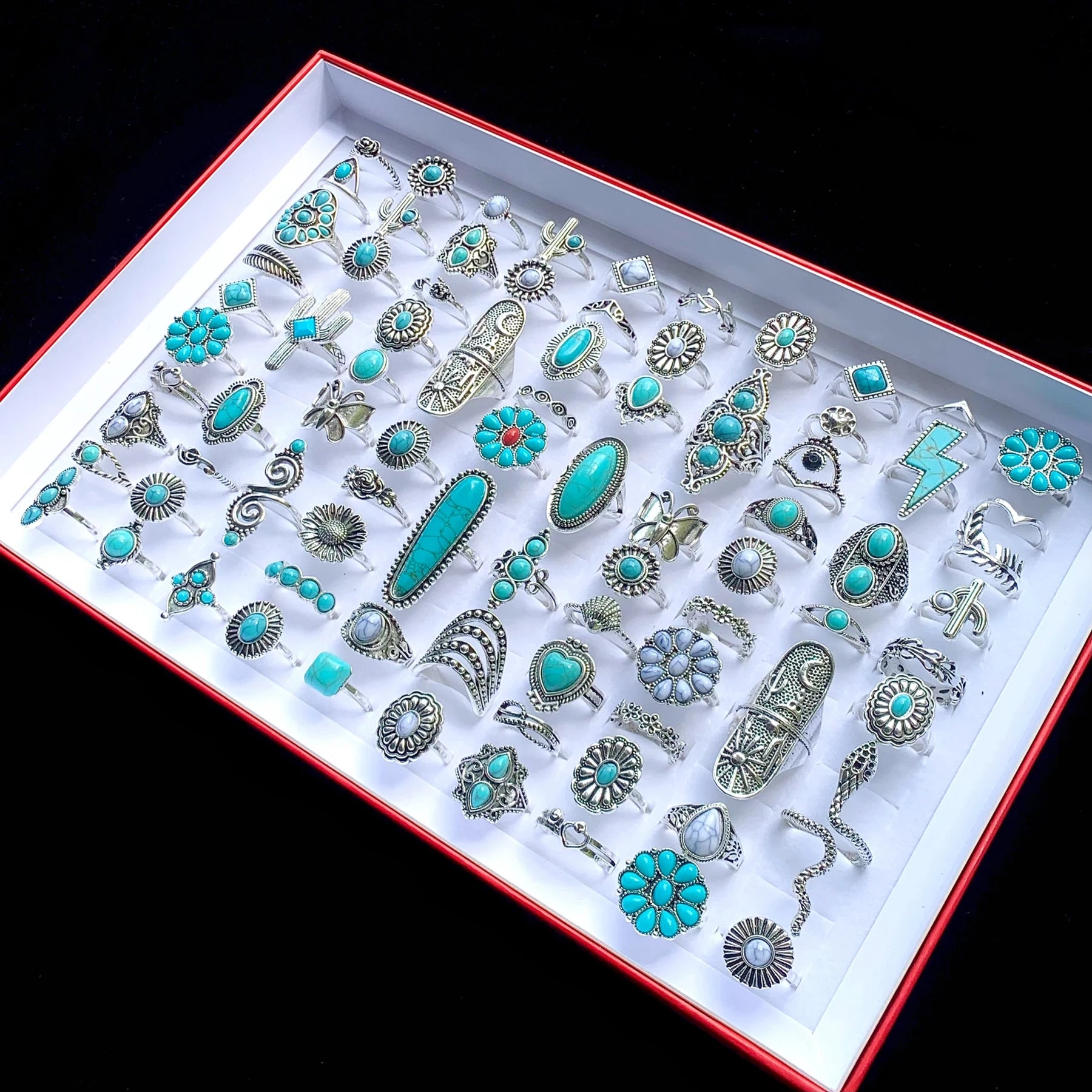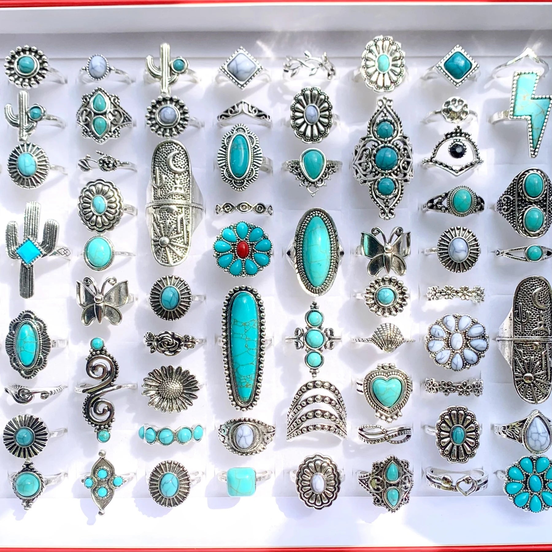 Discover the beauty and uniqueness of our 12pcs Antique Silver Plated Turquoise Bohemia Vintage Rings. Made with high-quality alloys, these rings are perfect for any occasion and will add a touch of elegance to any outfit. With a mix of styles and intricate designs, they make for a perfect gift for any fashion-forward woman. Upgrade your jewelry collection today and stand out from the crowd.