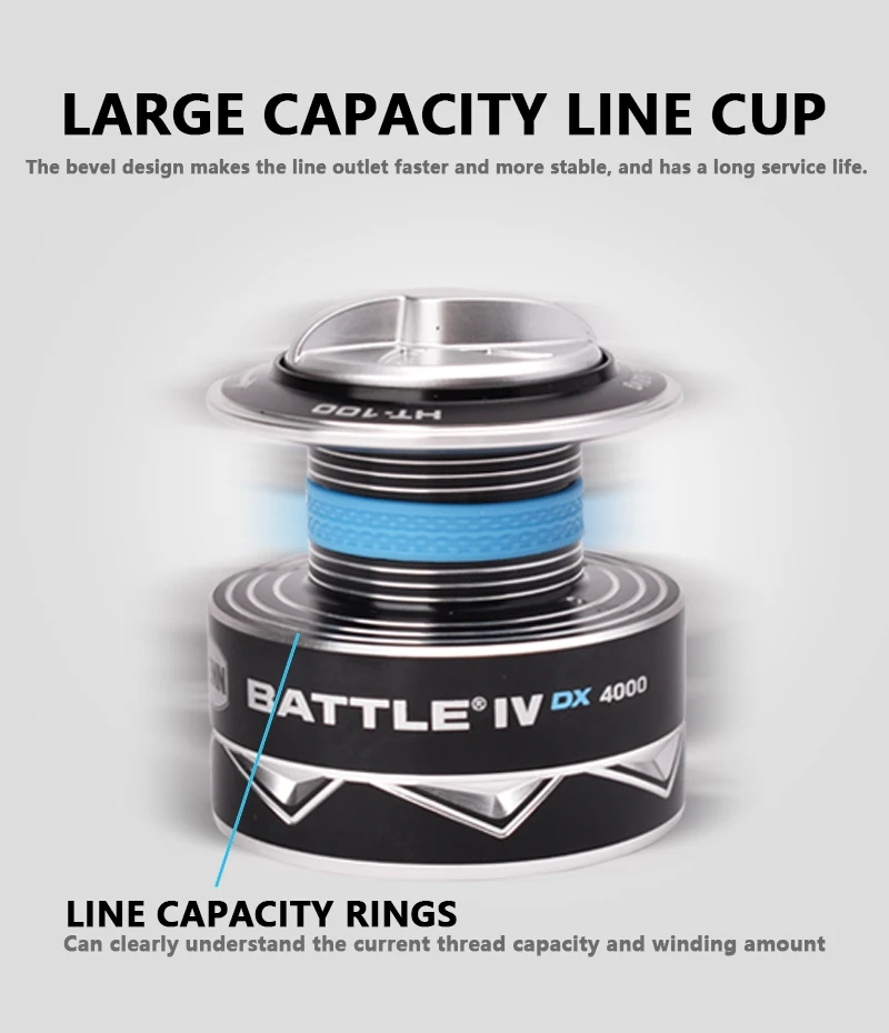 The DX series utilizes a brass main gear in all models as well as an improved HT-100 Carbon Fiber Drag system with an additional bearing underneath the spool. A lightweight EVA foam knob provides for extra comfort with the 2500 size featuring an I-shaped knob and all other models featuring ball-shaped knobs.