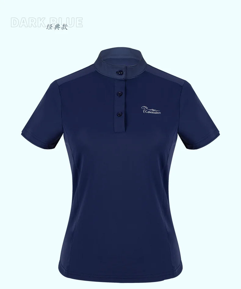 This Cavassion equestrian T-shirt is perfect for female riders competing in horse jumping and racing competitions. Its short sleeve design and navy color will keep you cool and comfortable while its white color and professional style will elevate your look.