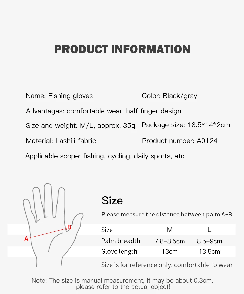 "These fingerless gloves are designed for both men and women who enjoy fishing, boating, kayaking, hiking, running, or cycling. Made with durable materials, they provide protection and comfort without sacrificing dexterity. Whether casting a line or paddling on the water, these gloves will enhance your performance and keep you comfortable. Perfect for any outdoor enthusiast."