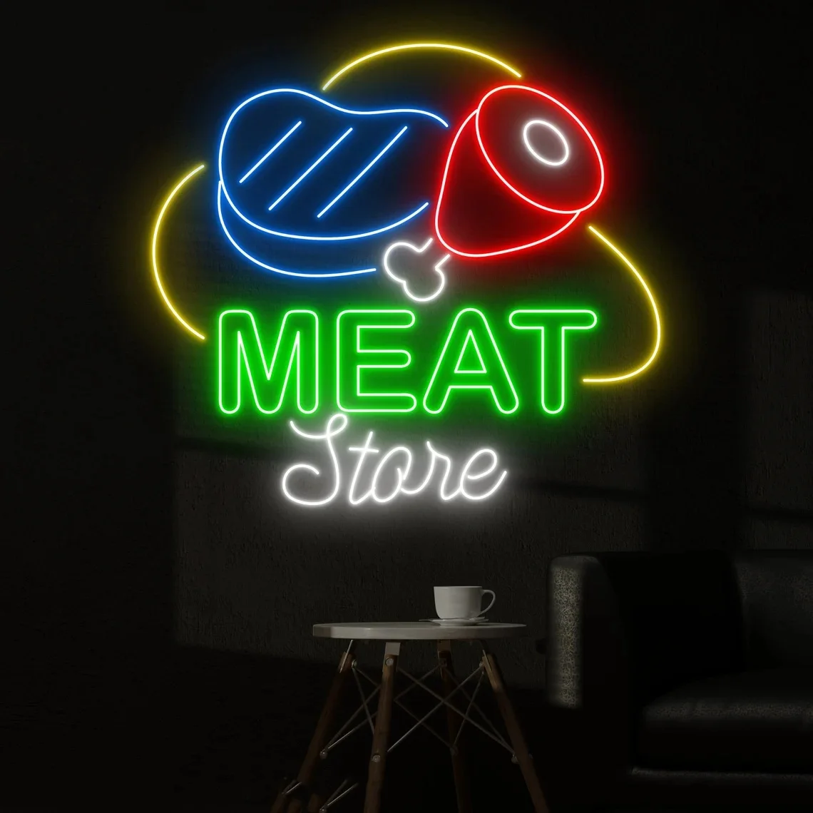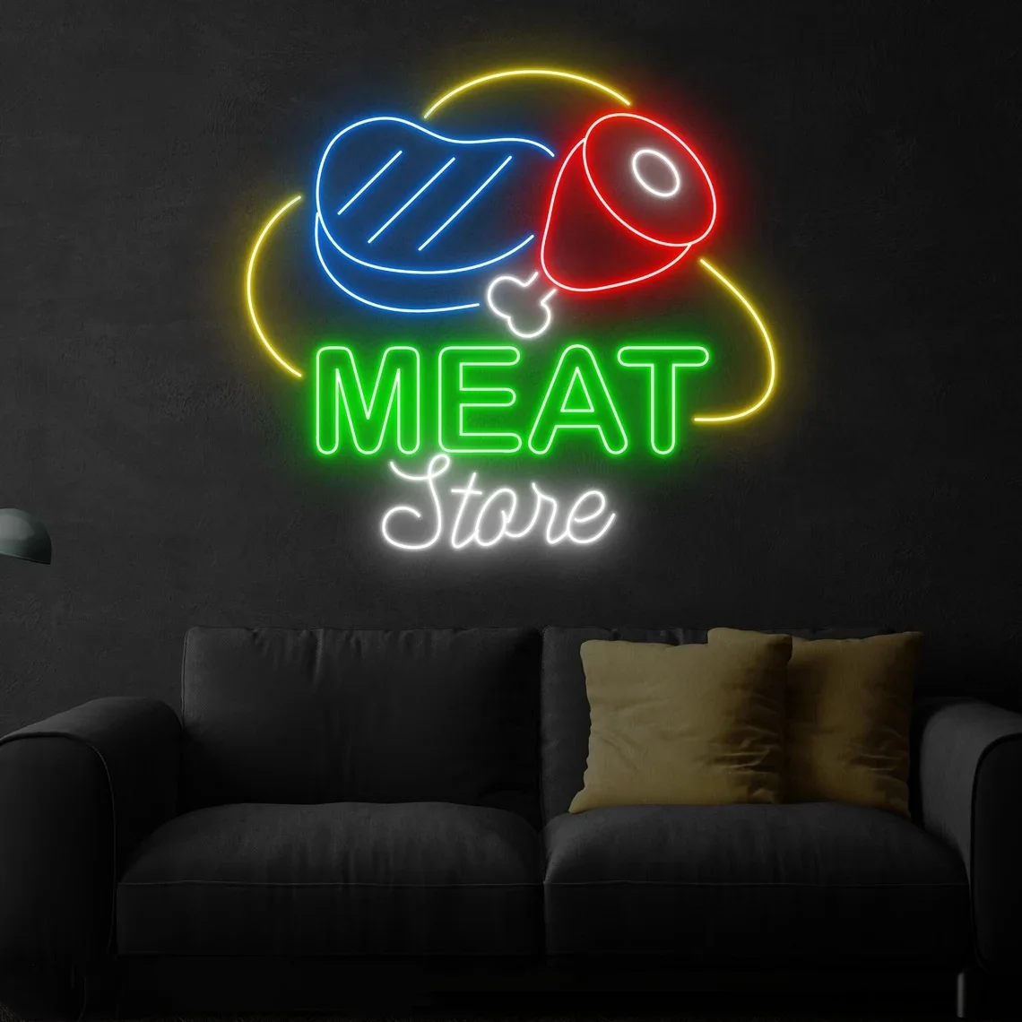 Illuminate your meat store or BBQ restaurant with a vibrant Meat Store Neon Sign. This unique wall decor features bright neon lights that will catch the eye of any meat lover. A must-have gift for any meat restaurant or BBQ enthusiast.