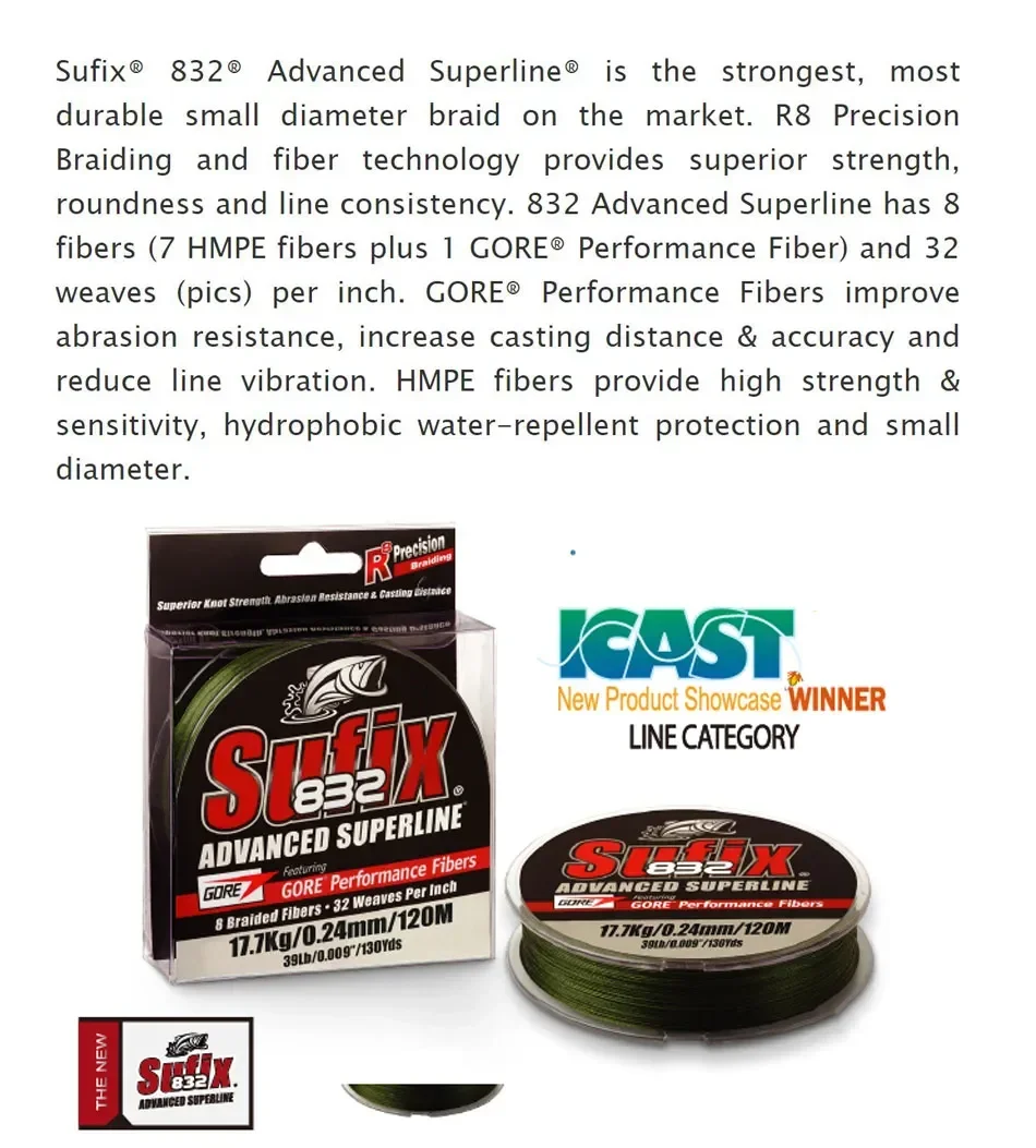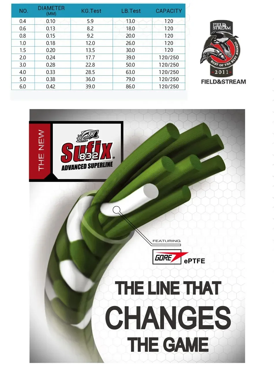 Sufix 832 Braided 8X braid Fishing Line 120M/250M