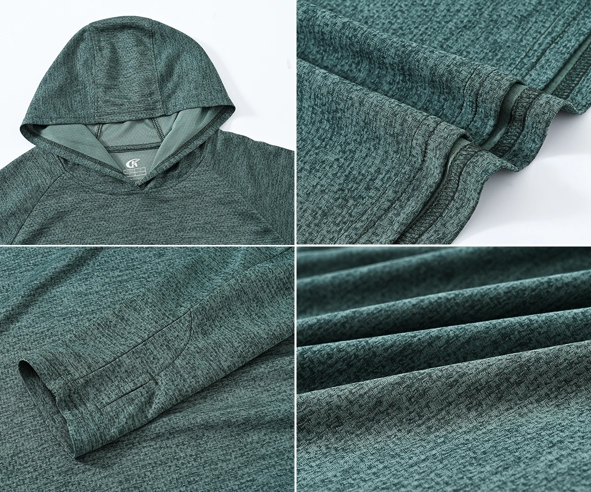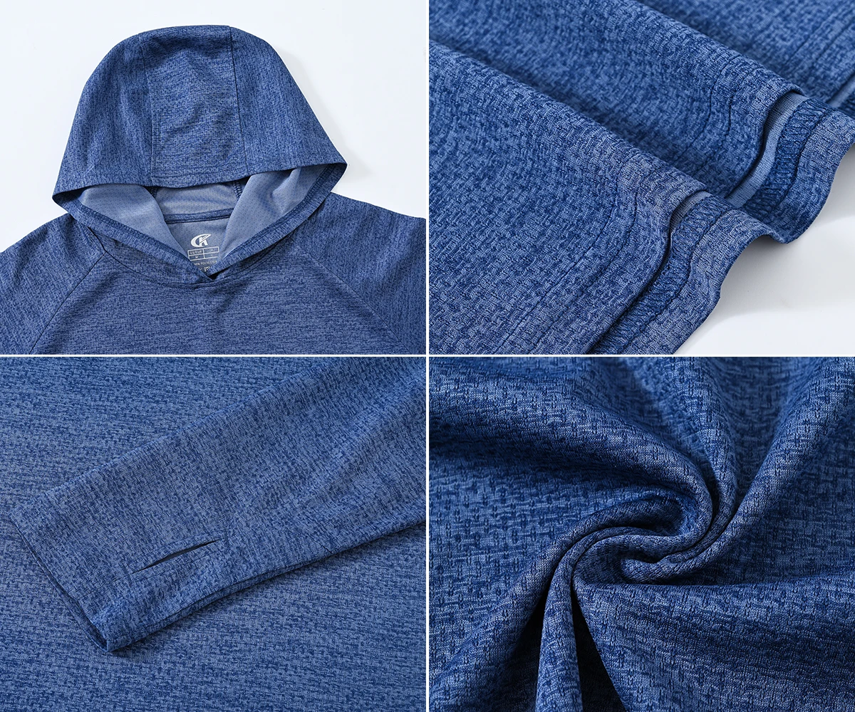 Hooded design preventing your neck form sunburn in the sun. Thumb holes keep the sleeves in place, and give extra back of hand protection